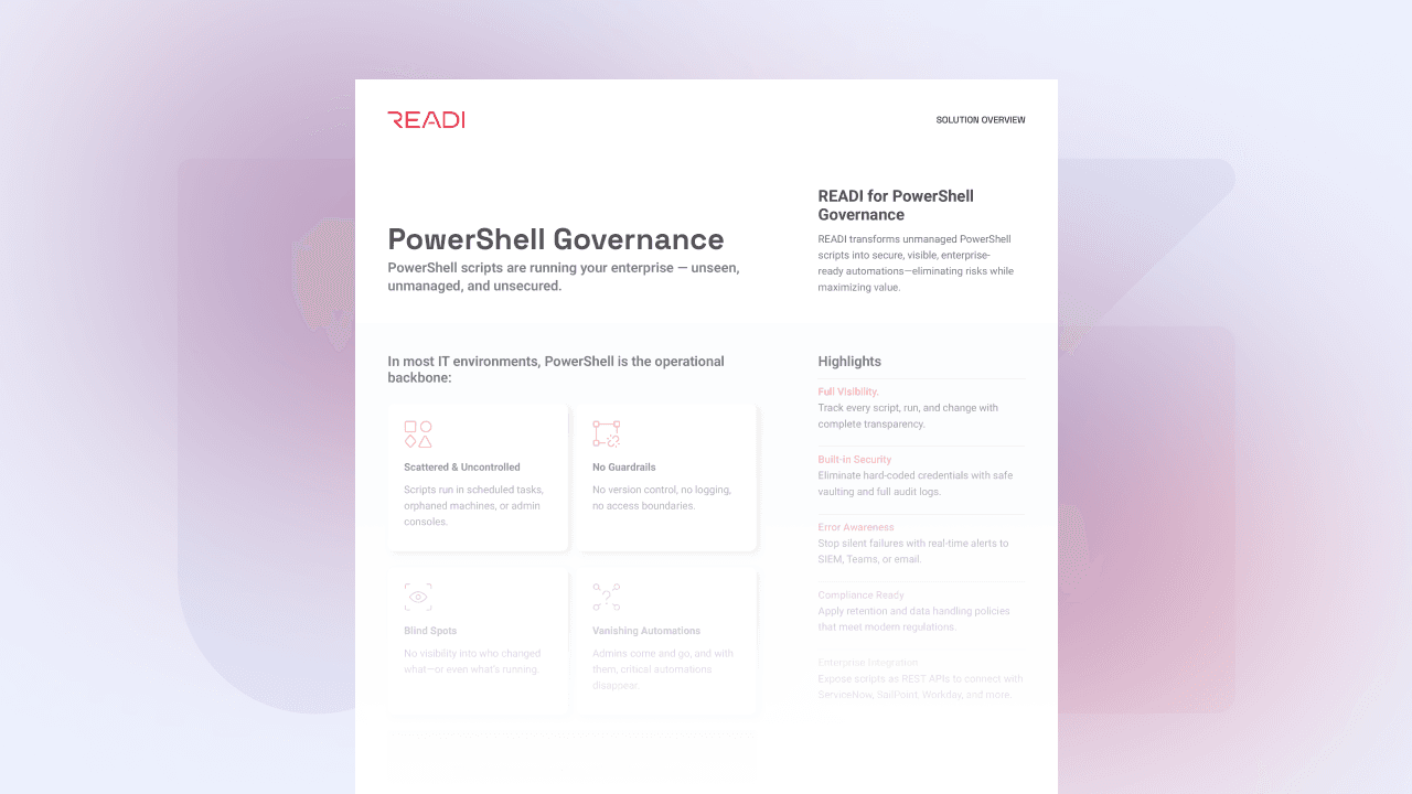 READI transforms unmanaged PowerShell scripts into secure, visible, enterprise ready automations —eliminating risks while maximizing value.